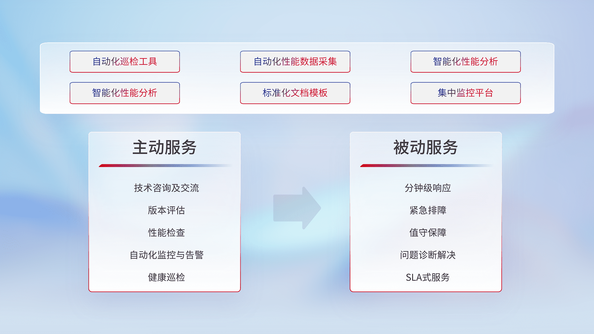 智能化工具和标准化文档,,保障服务质量,,,提供主动服务(包含技术咨询、、版本评估、、性能检查、、自动化监控与告警、、、、健康巡检)和被动服务包含(分钟级响应、、、紧急排障、、、、值守保障、、问题诊断解决、、、SLA服务)。。
